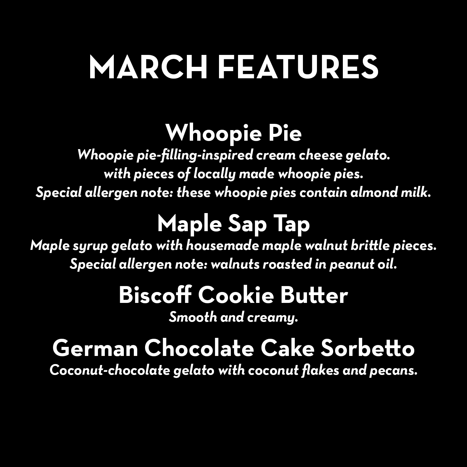 Since flavors are packed out of the case, they are not marked with allergens, ingredients, or nutrition panels. We cannot send on dates not listed. You cannot combine hand-packed and freezer pint packages in the same order. If we do not have a flavor you are seeking, we offer the Flavor Vault 6-Pack, where we will custom-run a batch of any historical flavor of your choice!